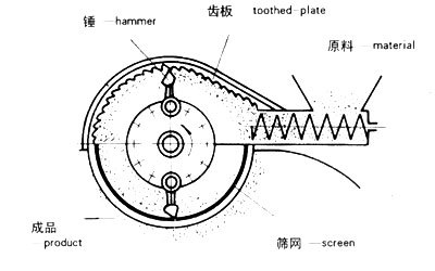 物料经过螺旋加料器进入机体内腔,利用围绕水平轴急速旋转的摆锤与齿板沟槽内形成的气流旋涡场,该涡流旋向与转子形成的主涡流旋向相反,粉体颗粒在此间互相冲击,同时也与摆锤发生碰撞进行粉碎。另一方面锤头前端和齿板间的狭窄间隙还起到剪切作用,少数未经过锤头的粉体颗粒则由上下侧齿板形成的涡流进行粉碎,***后细颗粒通过筛网排出。