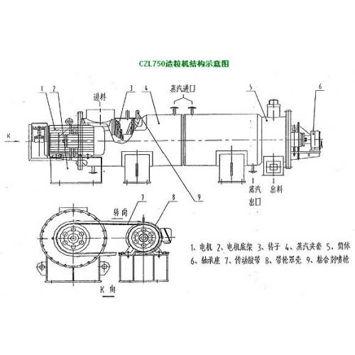 由电机通过变频器调整后,经过一对皮带轮传动,使筒体内转子转动。筒体上安置二组六只雾化喷嘴,用于喷射雾化粘合剂。粉体在筒体内,边前进边与粘合剂混合、捏合,干燥达到造粒的目的。同时筒体外部有蒸汽夹套对筒体加温、保温。电机用变频可调节转子的转速使粉体颗粒或产量达到所需的技术参数。